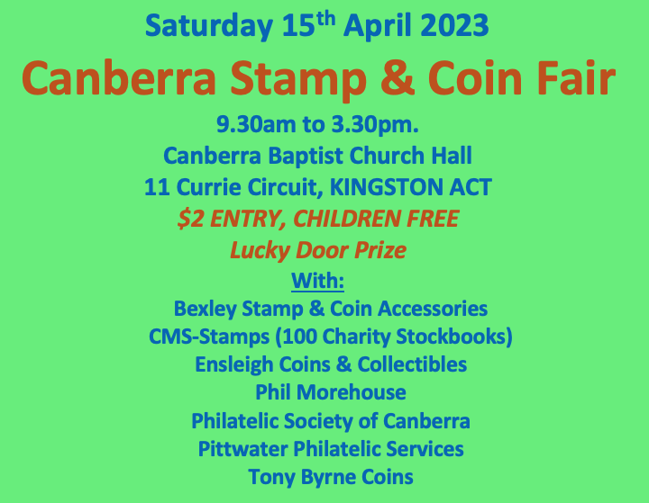 Canberra Stamp & Coin Market, 9.30am through 3.30pm, 11 Currie Cres Kingston ACT.