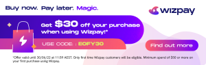 For a limited time, simply enter the following code at the Wizpay checkout: EOFY30 to get $30 off your first purchase when using Wizpay for the first time (minimum spend $50).